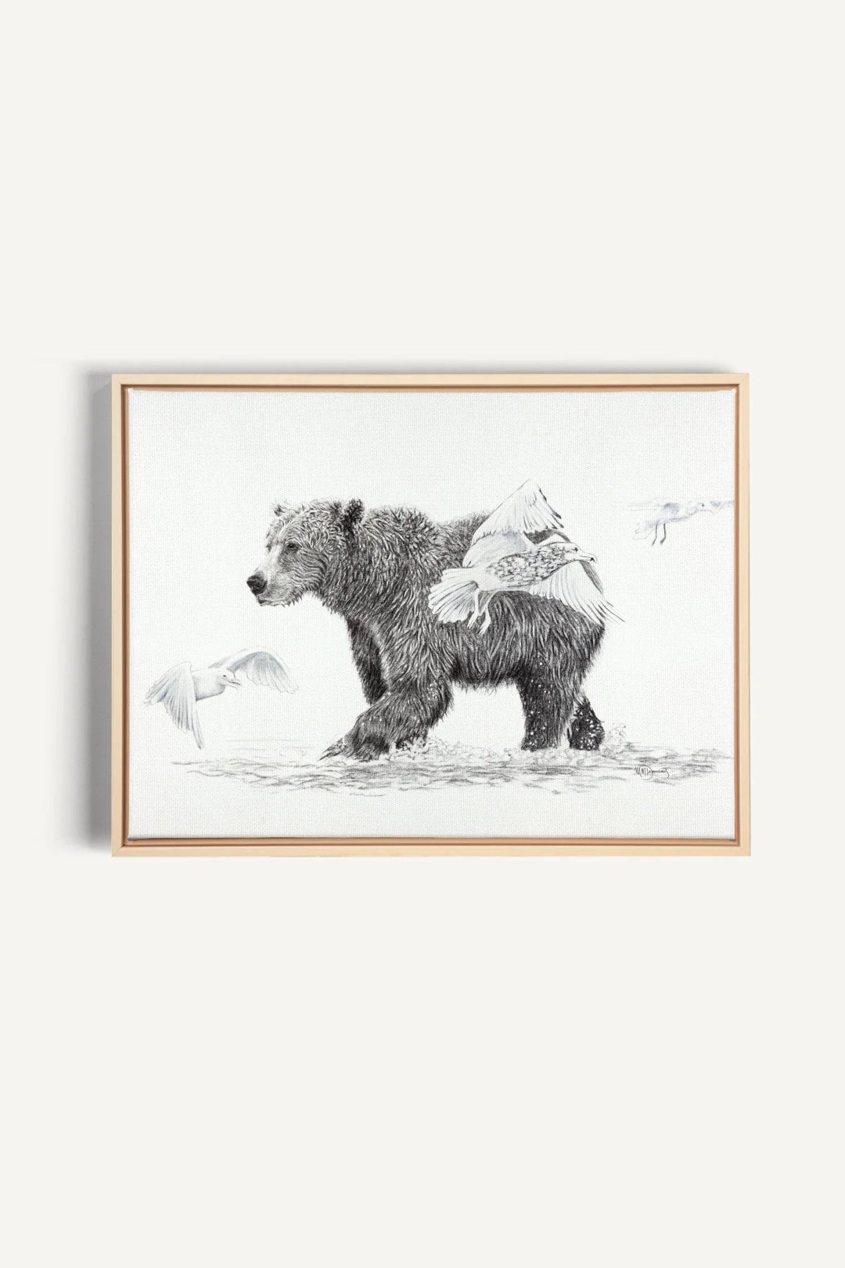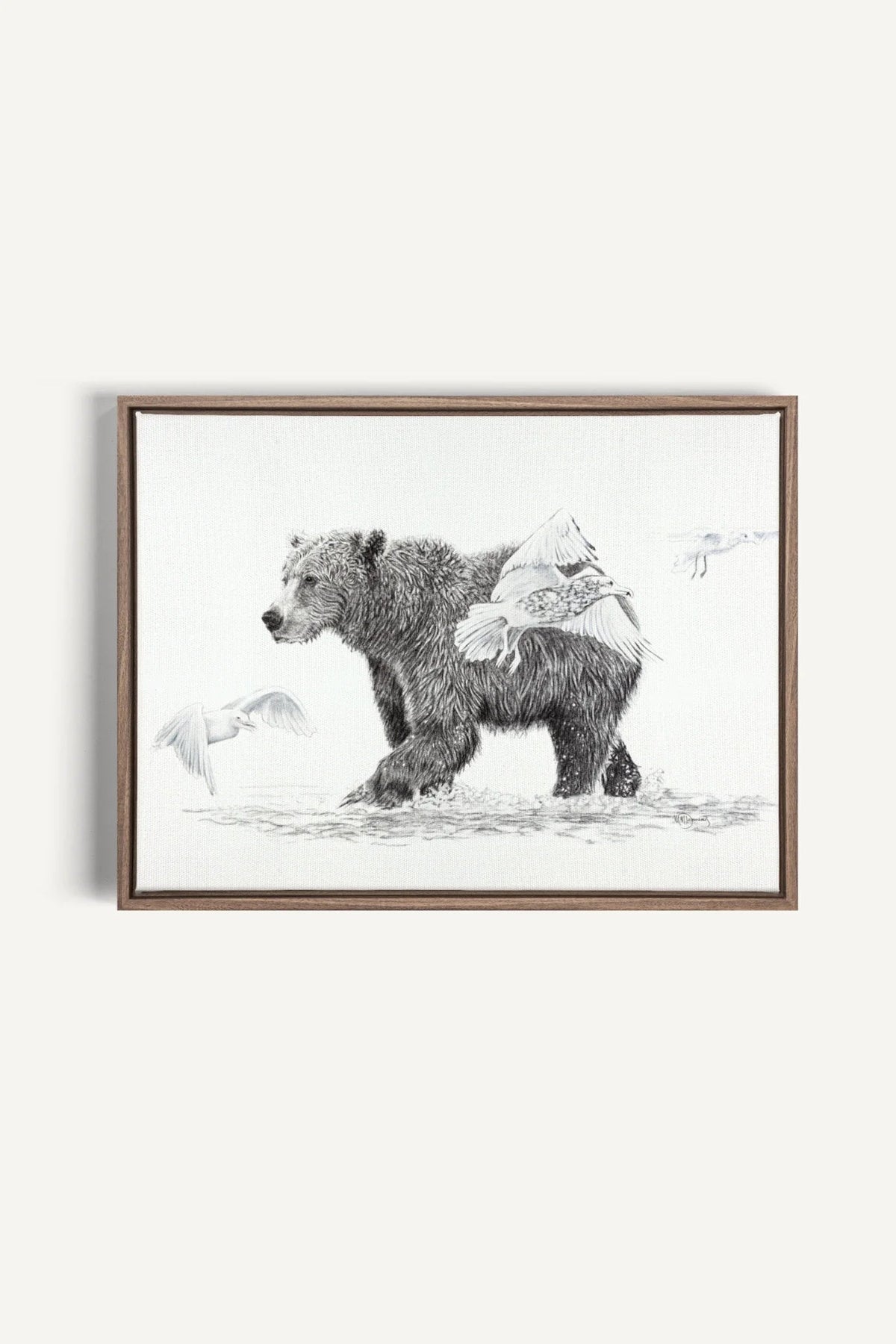 Magnificiant grizzly bear walking in water with birds flying around him. This Grizzly Bear fine art print is made from the original charcoal drawing of the artist Marie-Michèle Desmarais.